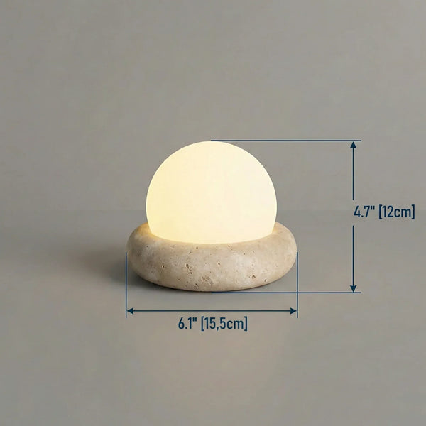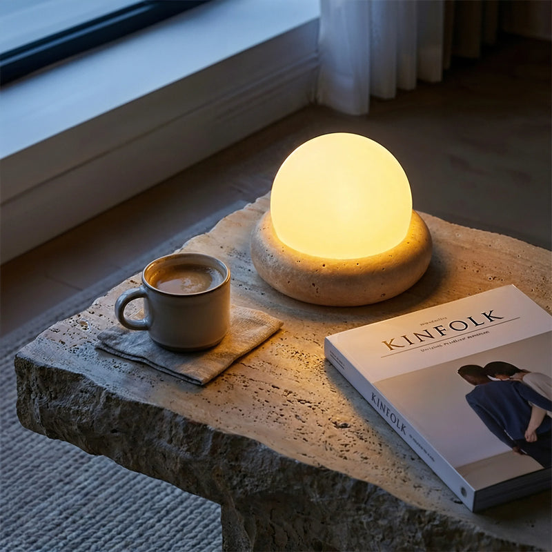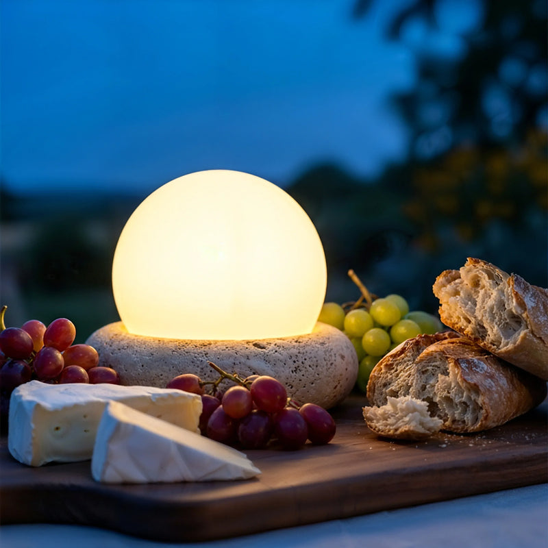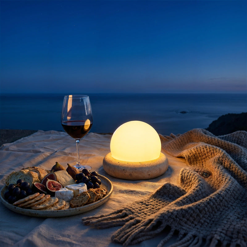 Engineered for sensory depth. The base is finished with a meticulous, porous texture that mimics the tactile irregularity of weathered limestone or travertine, providing a visual weight that grounds the piece. The illuminating sphere is crafted from high-diffusion matte polymer, selected for its ability to soften the LED output into a uniform, moon-like glow without harsh hotspots. The internal battery architecture is integrated seamlessly, maintaining the object's monolithic integrity while offering the freedom of wireless operation. It is built to be held, moved, and experienced.