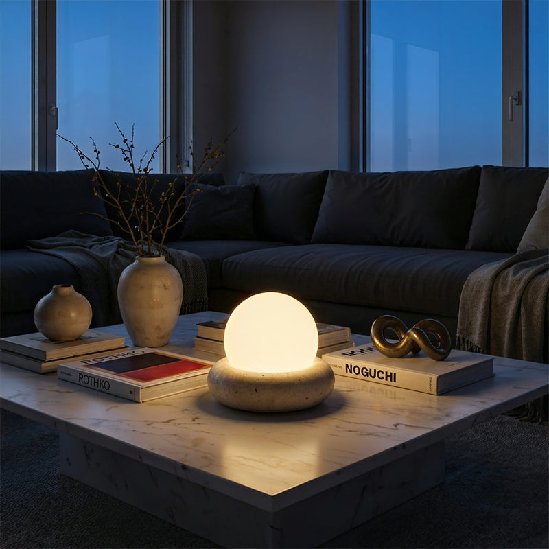The warmth of a private sanctuary. The Nomad Sphere is designed to create a mobile pool of intimacy. As the "Blue Hour" sets in and the windows turn deep navy, this lamp generates a soft, amber resonance (Warm Glow). It acts as a localized hearth, perfect for grounding a bedside table, a meditation corner, or a dinner setting. It does not illuminate the room for utility; it claims the space for serenity, offering a gentle, warm counterpoint to the cold darkness outside.