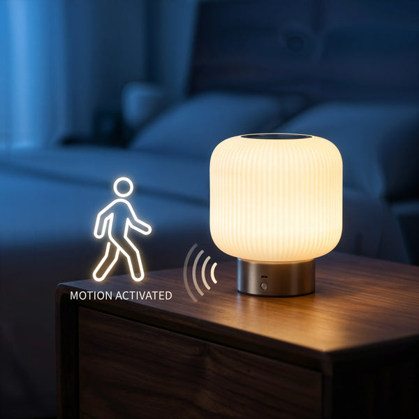 The Guardian is not merely a utility; it is a companion that understands the rhythm of your home. Its design is a study in softness—a rounded, architectural silhouette of fluted glass resting on a grounded metal base. Where other lamps demand attention, The Guardian waits. Its integrated motion sensor transforms it from an object into an experience: a light that greets you without a touch, respecting the silence of the night. It is designed for those intermediate moments—between waking and sleeping, between dusk and dark—providing a guiding glow that feels less like technology and more like intuition.