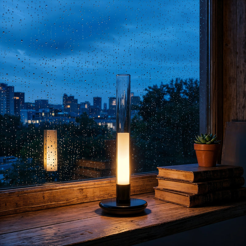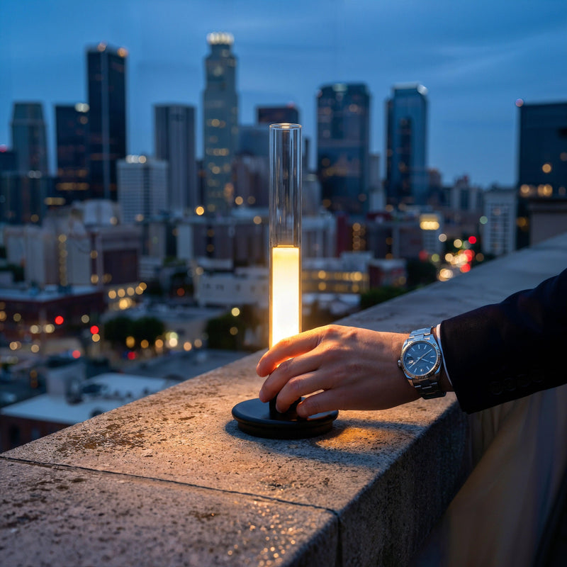 Engineered for transparency and touch. The primary cylinder is crafted from high-grade borosilicate glass, selected for its exceptional optical clarity and thermal resistance. The base is machined from a solid aluminum alloy with a matte brushed finish, providing a low center of gravity that resists tipping despite the lamp's vertical profile. The internal LED components are calibrated for color consistency, ensuring the light remains a true warm amber over the battery's lifespan. The touch-sensor integration is seamless, preserving the monolithic silhouette of the design.